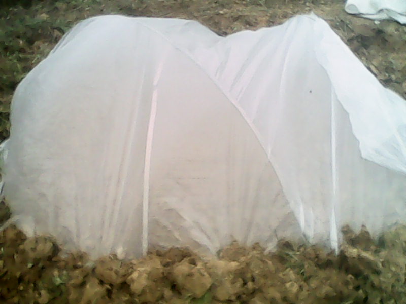 盖好后,母亲用一节量好的白色幕布,用竹条做骨架来支撑,给玉米粒儿们搭上了小帐篷。边缘用泥土压严实,这一个个小帐篷真有几分科学先进的气息呀,小玉米粒儿们安静地在这温暖的小帐篷里,快快成长,再过一个星期你们就要长出绿色的叶子,去为夏末的丰收而拼搏了。