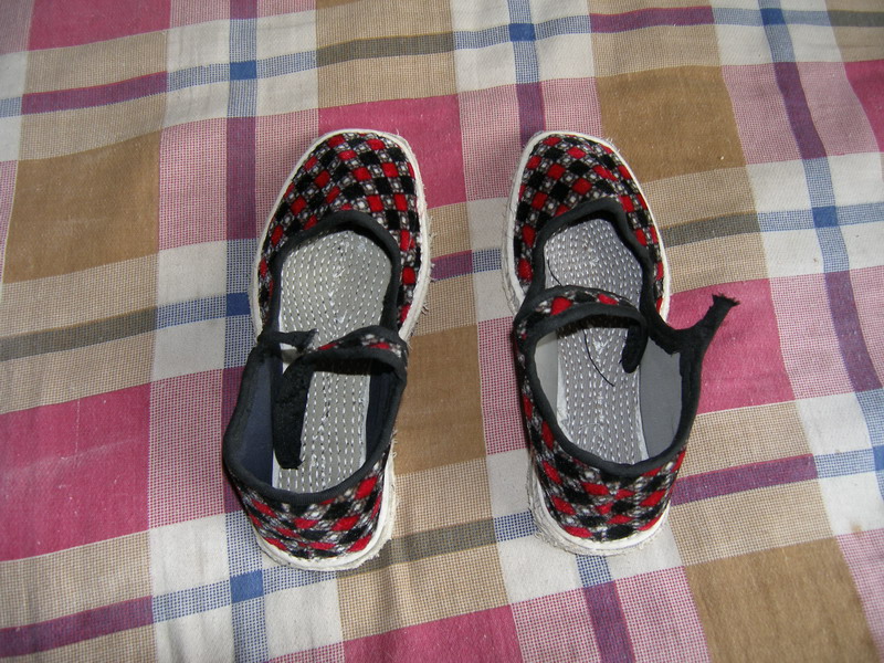 鞋邦是组成鞋的重要部分之一,所以做鞋邦时更仔细、更认真 ,要让人看起来更美观。看这双鞋邦做的多么细心。把鞋边用白色和黑色的布一针一线的缝上去。在白色和黑色之间夹杂着花布鞋面,看上去更加漂亮。鞋边上的一针的细心却看不出有没有用针缝过它。