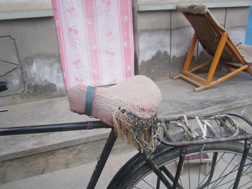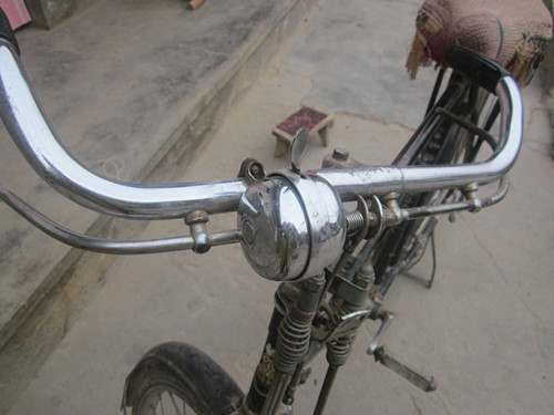 真别说,爷爷还挺会装扮他的自行车。在这辆自行车车头上,安了一个车铃,车座垫的周围安装了一小圈装饰品;车尾呢,还钉了一朵假小花。