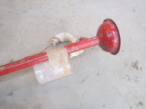 它虽然构造简单,但用起来还真不容易。在这玉米器上先安装一个饮料瓶的下半身,在里面放玉米用,在玉米器的中间,有一个把柄,只要把这个把柄一捏,下面的一张小三棱栓的“嘴”就张开了,这样,每一个玉米便会顺着这条道“跑”下来,从这张嘴里出来,掉进那一个个小泥洞里。看!挺不容易的吧!
