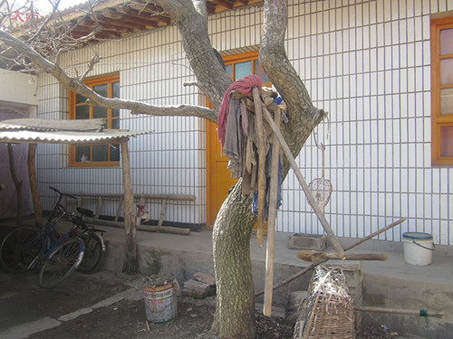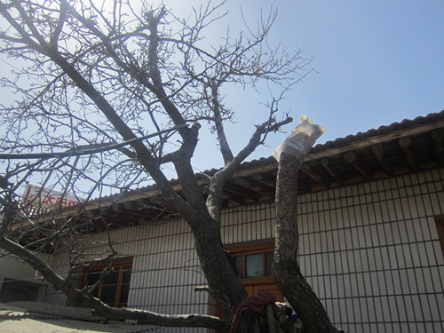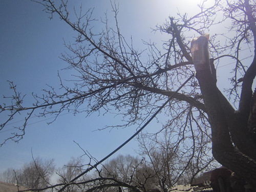 这棵树的枝干,直通我家的房顶,给我们带来了很大的作用,比如:每当下雪时,电视锅便会被雪覆盖,电视就会没有信号,爷爷便可以借助这棵树到达房顶,用笤帚扫去上面的雪,电视又可以看了。
