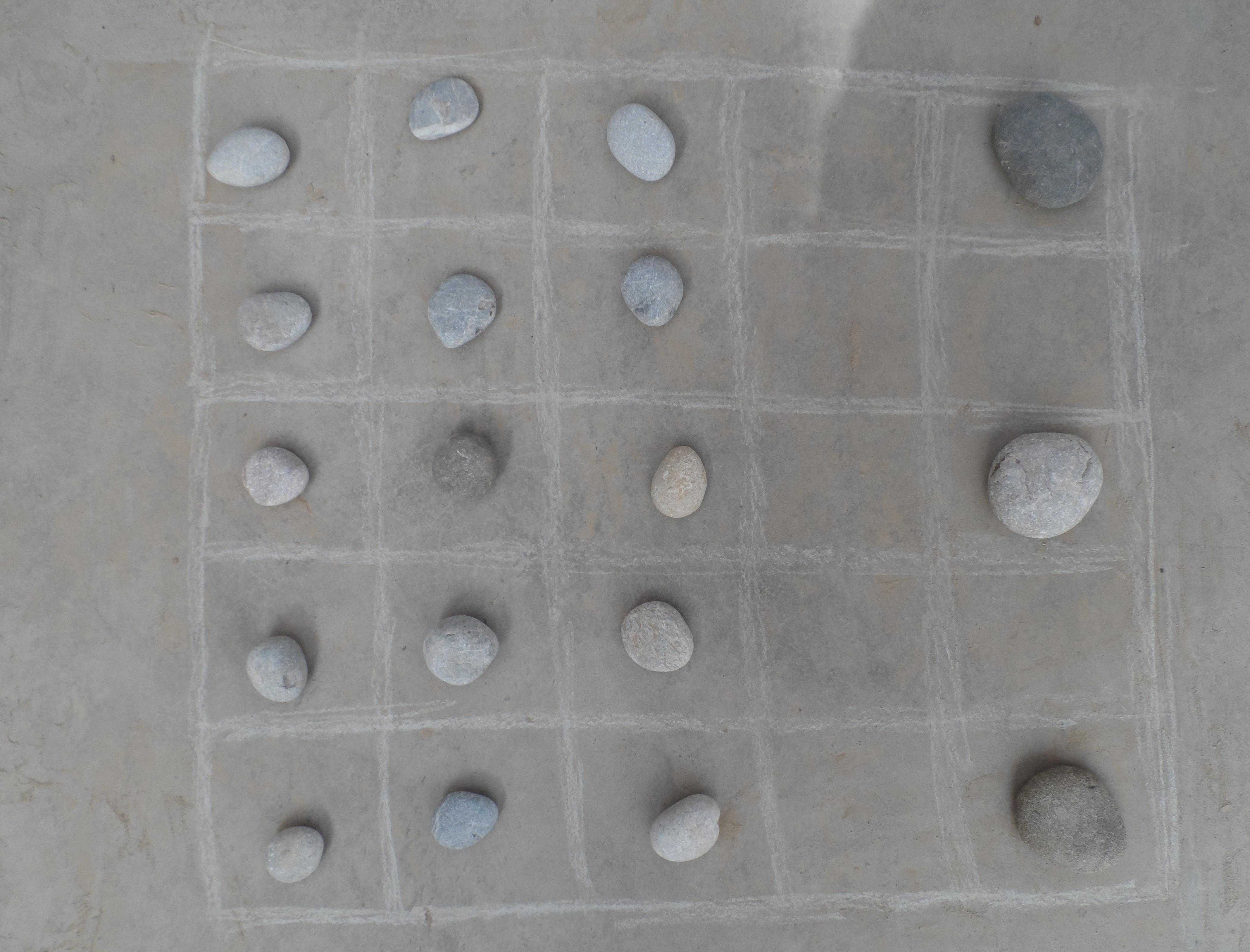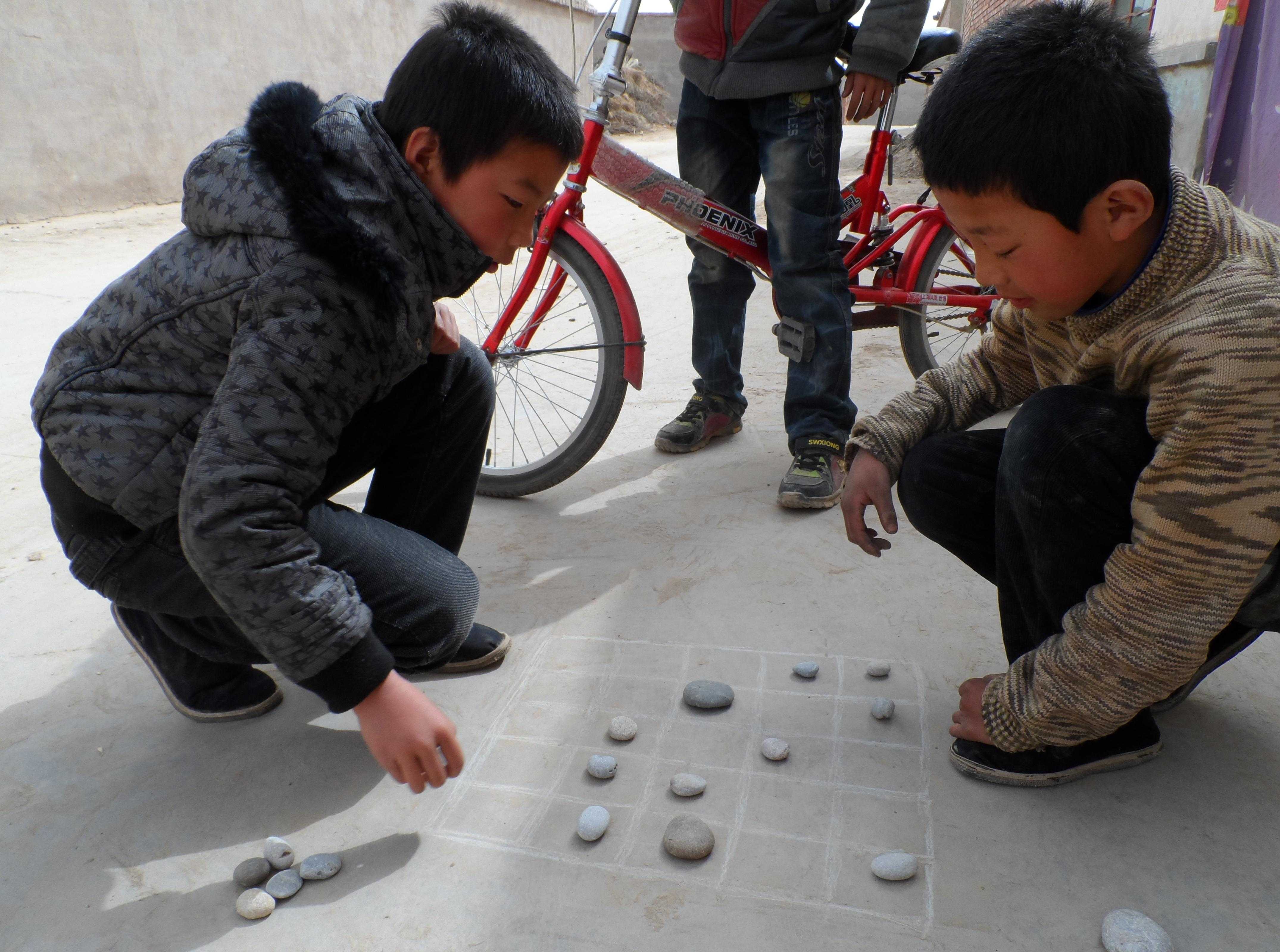 玩时先要在地上画一个有二十五个网格的方框,然后找十五个差不多杏核大的石头做"羊",在另外找三个较大的石头当"狼",十五只"羊"摆在一边,三只"狼"放在另一边。