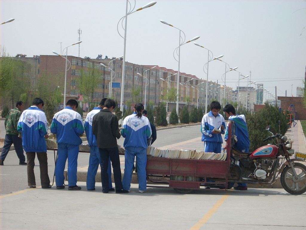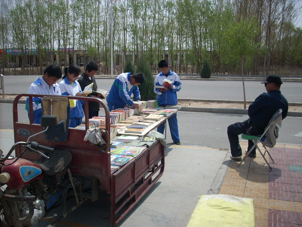 这个小书摊很简单,是流动式的书全摆在一辆半新不旧的三轮车上。卖书的叔叔告诉我们每本书以多么诱人的价格出售,我也曾经两周不吃饭省下20元买了散文集和《钢铁是怎样炼成的》,我觉得这很值得,或许是因为我是个书痴吧!
