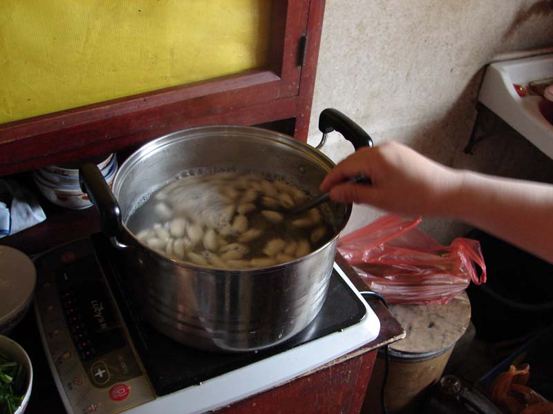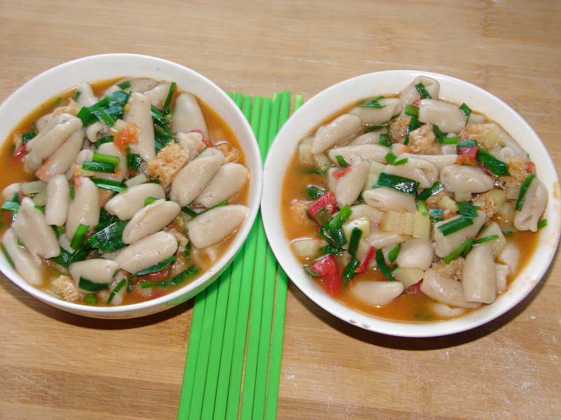 搓完所有的马狮子后,就可以下锅了。这里要注意的问题就是火候,不能太大也不能太小。如果火大了,锅里的马狮子就有可能变成糨糊,太小了就半生不熟。煮到马狮子身着青色,就表明煮好了。在等待煮沸的同时,单另用一口锅调好浓味的汤菜。制作时可利用红葱、西红柿、青椒、土豆、面筋、豆腐等做原料,总之要让汤菜有各种颜色。把煮熟的马狮子用漏勺全都盛放到汤菜锅中来个"驴打滚",盖好锅盖等待两分钟左右,就可以盛碗了!