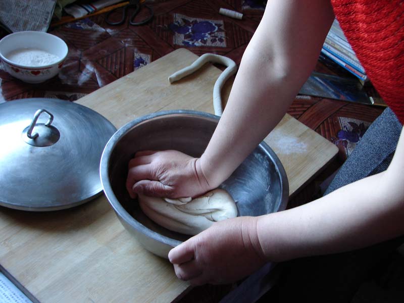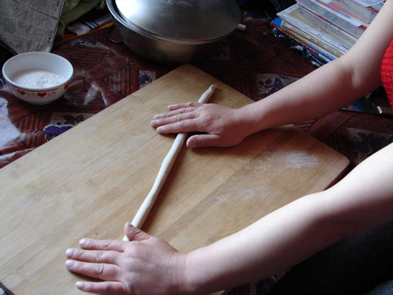 制作马狮子的第二道工序就是搓面。这可非同一般,由于和面用了少许的盐,搓的时候面条会一收一缩,活象蚯蚓爬行呢。所以先要用手使劲地捏成条状,然后把条形的面放在案板上使劲使劲的来回滚搓。看着妈妈灵活的搓揉着面条,我羡慕极了!