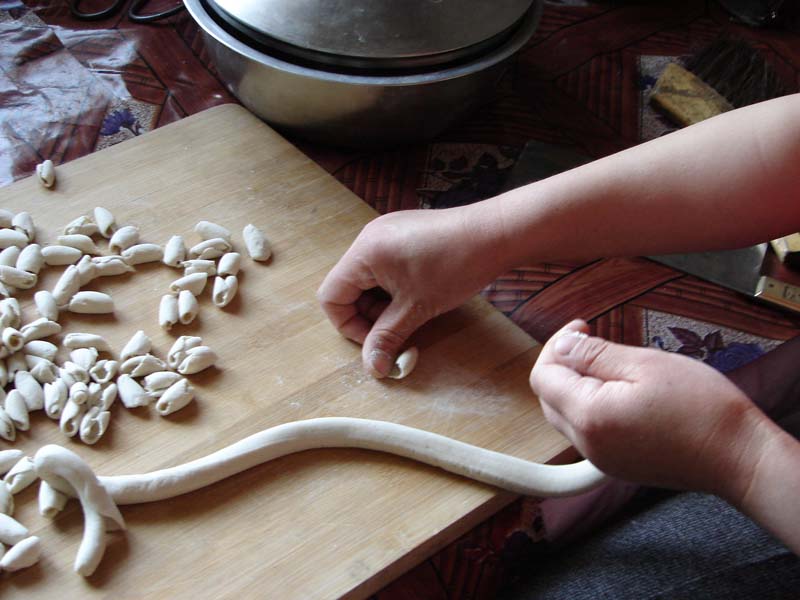 等到把面条搓得足够细时,用左手抓住搓好的面条,右手从面条上揪下一小疙瘩,将其放在案板上用大拇指按住使劲一刺,一个马狮子就这样诞生在我们手指之下了。