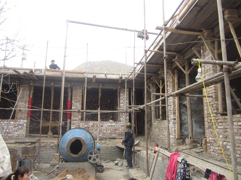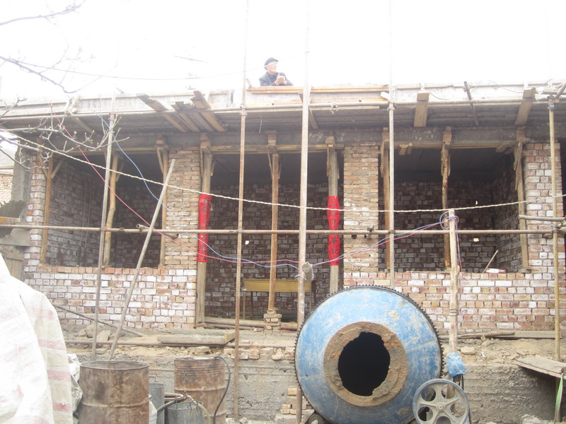 因为楼板短,所以房子的前沿无法铺到,又要用混凝土铺了。于是房子的里里外外全是钢管搭的架,用来支撑混凝土。搅拌机无时无刻的轰鸣着,发动机吊着混凝土上上下下,人们的铁锹不安分的乒乓作响,编织着我们农村人家特有的庄重而神圣的交响曲。