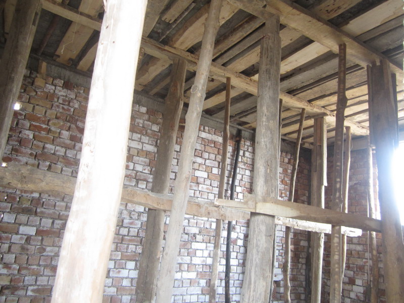 厨房因为设在了角落里,所以楼板太大,无法扑倒,所以要用水泥和钢筋搭配,铸成顶,而且要用木板来支橙,用一根根木头把一块块木板顶起来,再铺上一层钢丝网,就可以把混凝土上了。混凝土真重,要用发动机吊它,于是我在上面开发动机,忙的不亦可乎。