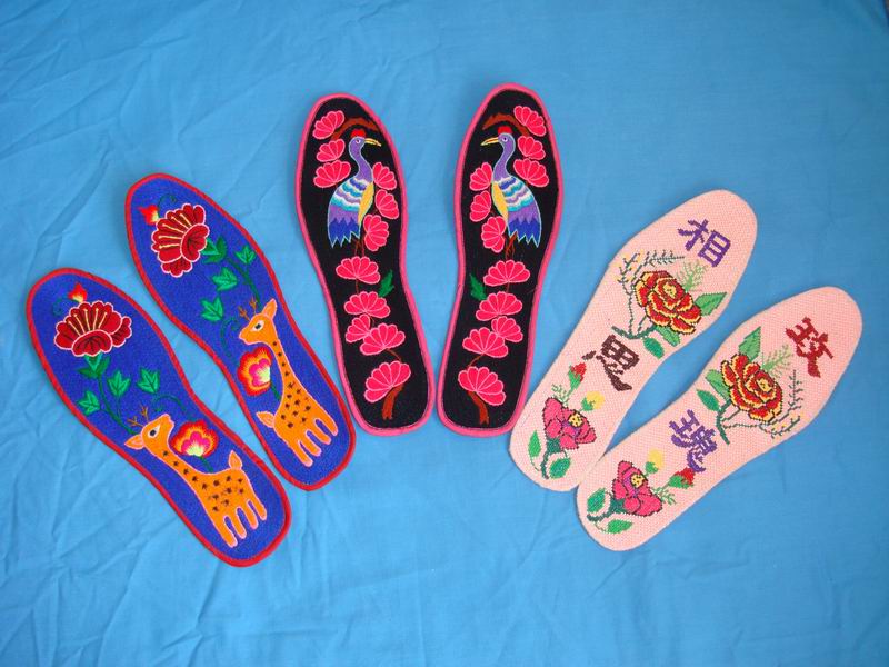 你可千万不要小瞧了纳鞋垫儿这种活儿,它可是大有讲究的。就拿第一道工序——粘鞋层儿来说吧。选择布料时,一定选些棉布,绝不能选那些"高价布",不然会很难粘住的。粘鞋层时一定要用稀一点儿的莜面浆子。粘好的鞋层儿最好用东西均匀地压在它上面,只到干为止,否则会起泡不好用。粘好的鞋层最外层最好是白色的,为了便于突出将来绣上的图案。