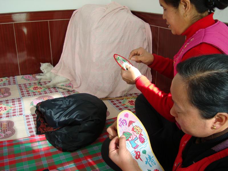 每当进入冬季,恰逢农闲时节,妇女们三个一伙,五个一群地围坐在火坑上,有说有笑,穿针引线,开始了她们拿手的绝活——纳鞋垫儿。别看那小小的布条,可一到她们手里,摇身一变就变成了一件件生动诱人的"手工艺品",令人爱不释手。