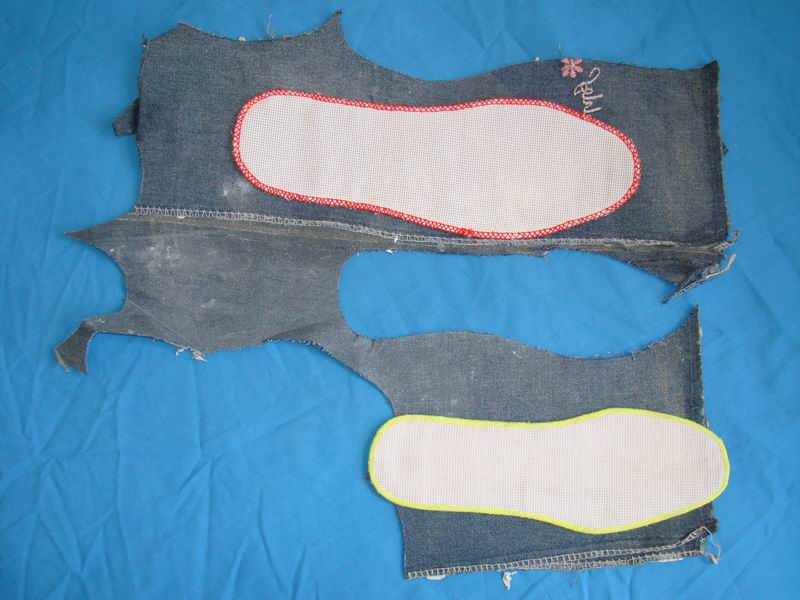 鞋层儿弄好后就可以根据所纳鞋垫大小往下剪鞋垫的雏形了。剪好后,先把边用布或彩色的线镶好,目的是为了加固鞋垫,防止边开。而后就可以选择图案了。图案可以是自己画的,也可以是市场上买现成的。选择的关键取决于你的鞋垫要送给谁,要表达什么意思。它呀,可以送任何人,表达任何意思。