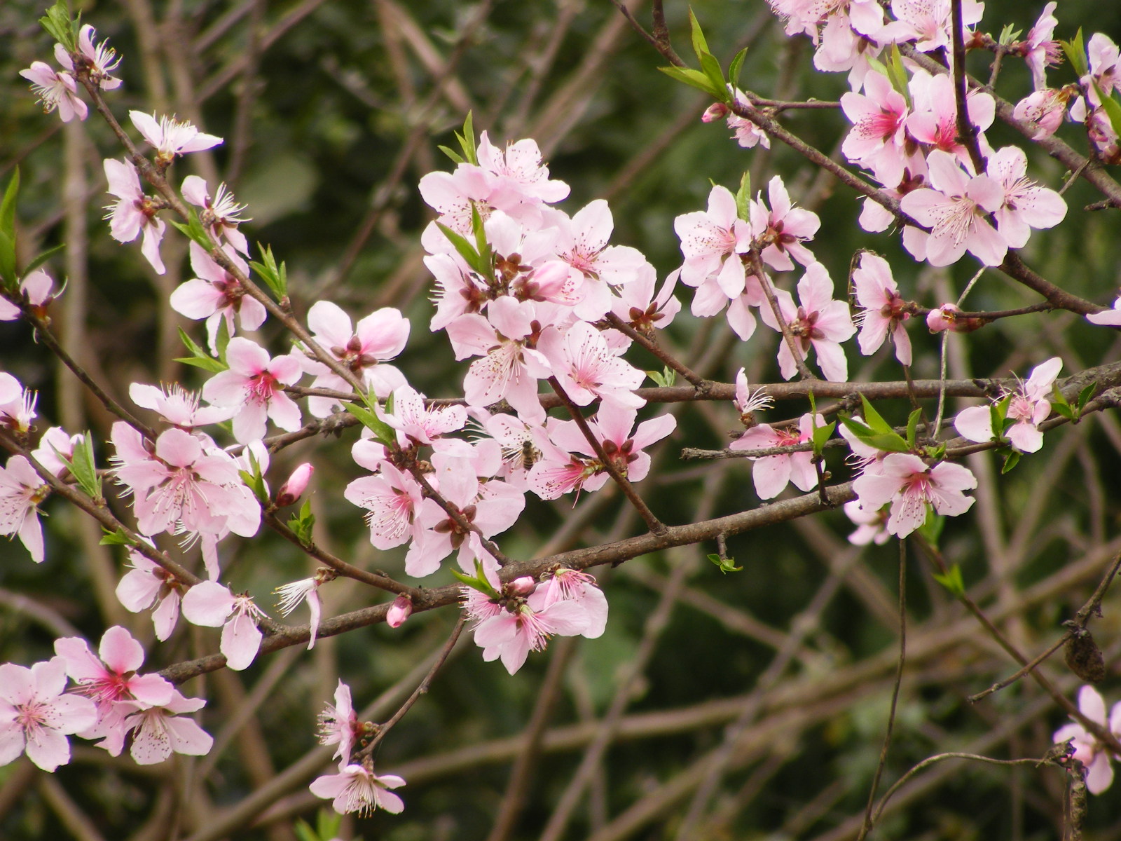 桃花像喝醉了似的,满枝绯红,又有许多蜜蜂在花间飞舞,枝条上偶尔有嫩绿的叶芽,把花朵衬托得更加娇艳。漫步于花间,真是"人面桃花想映红"。叫人陶醉!