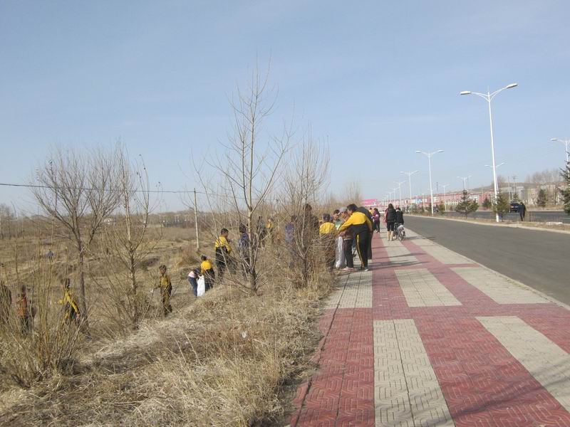 七点五十,我们在教学楼前集合,赵老师给各班分了一些袋子,还有一把铁锹和一个竹竿。老师们也站在我们的队伍里,穿着平底鞋,运动衣,整装待发了。八点整,在赵老师的一声令下,我们排着整齐的队伍出发了。一路上,老师们紧紧地跟在我们的侧面,生怕丢了一个,或是被路过的车辆撞了我们。不一会儿我们就在说说笑笑中到了目的地。