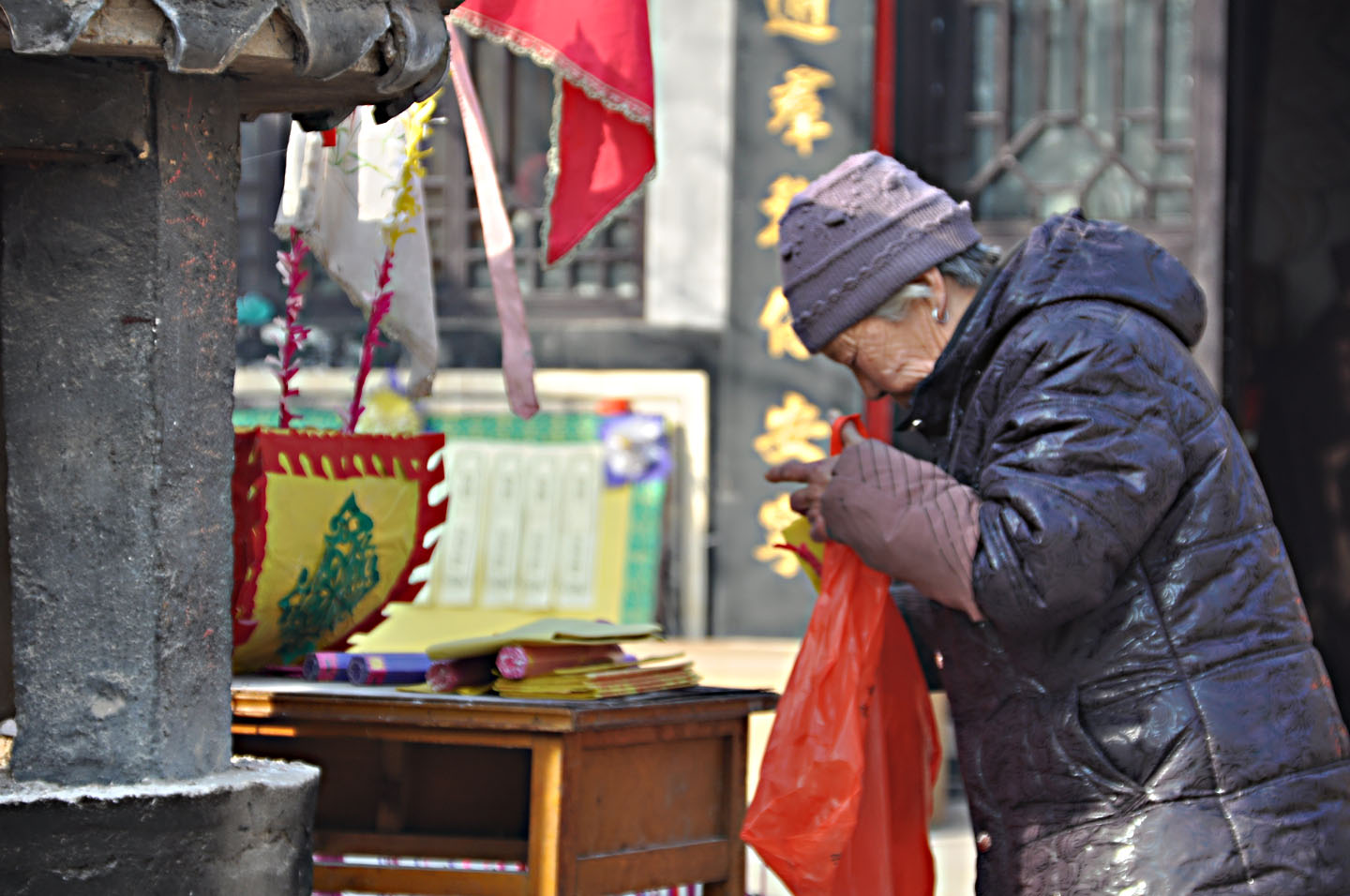 你看那个老奶奶来庙会,正在找自己带的香烛、纸裱之类的东西,一看就知道是虔诚的佛教信徒。其实庙会原是寺庙的一种宗教活动,人们在庙内烧香礼佛,庙外还有各种饮食摊点、百货摊点,有时还会有一些助兴的杂耍曲艺表演等等,从而形成以民俗文化表演为主的活动。随着时代的变化,古老的庙会也增添了不少新的内容,如借庙会之时洽谈生意、交易货物等等,但展示民俗一直是庙会最主要的特色。