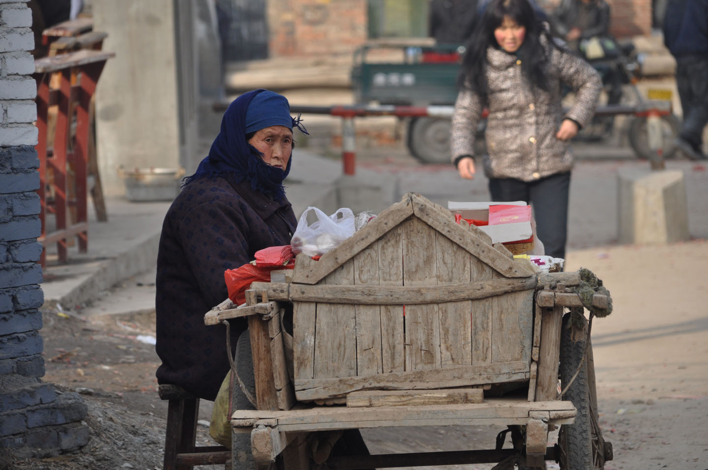那个用头巾包着的老婆婆,用破旧的人力车摆放着庙会香客上香要用的东西,来做点小生意,这是不容易啊!