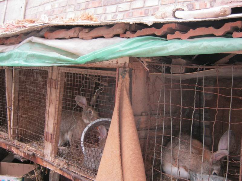 姥姥家的兔舍也是很有讲究的,有单间,也有套房。单间里放着公兔子,套间里住着一窝刚满月的小兔子,还有双人间里住着一对母兔子。大兔子都是以土黄为主色,白肚皮的杂色兔子,而那些小兔子可能有的遗传了兔妈妈的基因,也是杂色的,有的遗传了一些兔爸爸的基因,黑色的蹄子,白色的嘴巴,真是可爱。