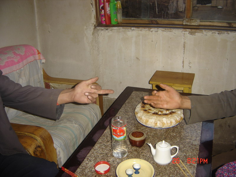 拇战民间叫划拳或猜拳。有大拳和小拳之分,小拳又名"赶羊",即拇指胜食指,食指胜中指,最后小指转过来胜拇指。大指即呼猜胜拳,划拳时两人同时呼叫各自要猜的一个数字,并同时伸出一个手的若干手指,看谁呼喊数字正好是两个伸出的手指之和,谁就胜了,输家饮酒。划拳时的呼喊法:零为宝一对;一为当朝一品,一点一元;二为两家好;三为三元报喜,三星高照;四为四季发财,四红四喜;五为五福临门;六为六六逢春,尕六六儿撒圆了;七为七巧成途;邀(qiao)着家里坐;八为八仙庆寿;九为快发九百万;十为十满大堂,全家富禄寿。