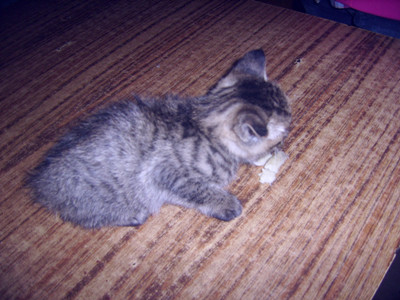 有一天,这只猫用双脚轻轻地抱着我的手,用牙咬着我的手,我还以为它在和我开玩笑。谁知它是看中了我手里的面包。我一不留神手中的面包连面包渣都不剩。我很生气,正准备出手打它,它立刻表现出可怜的样子,顿时让我哭笑不得,之后又逃走了。