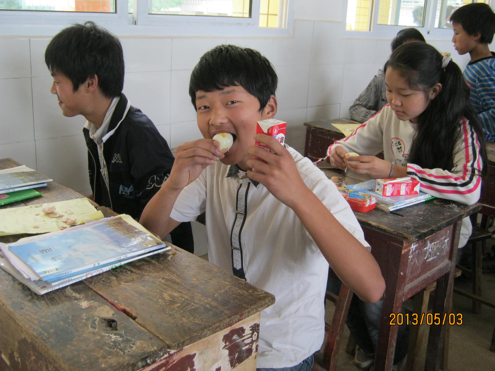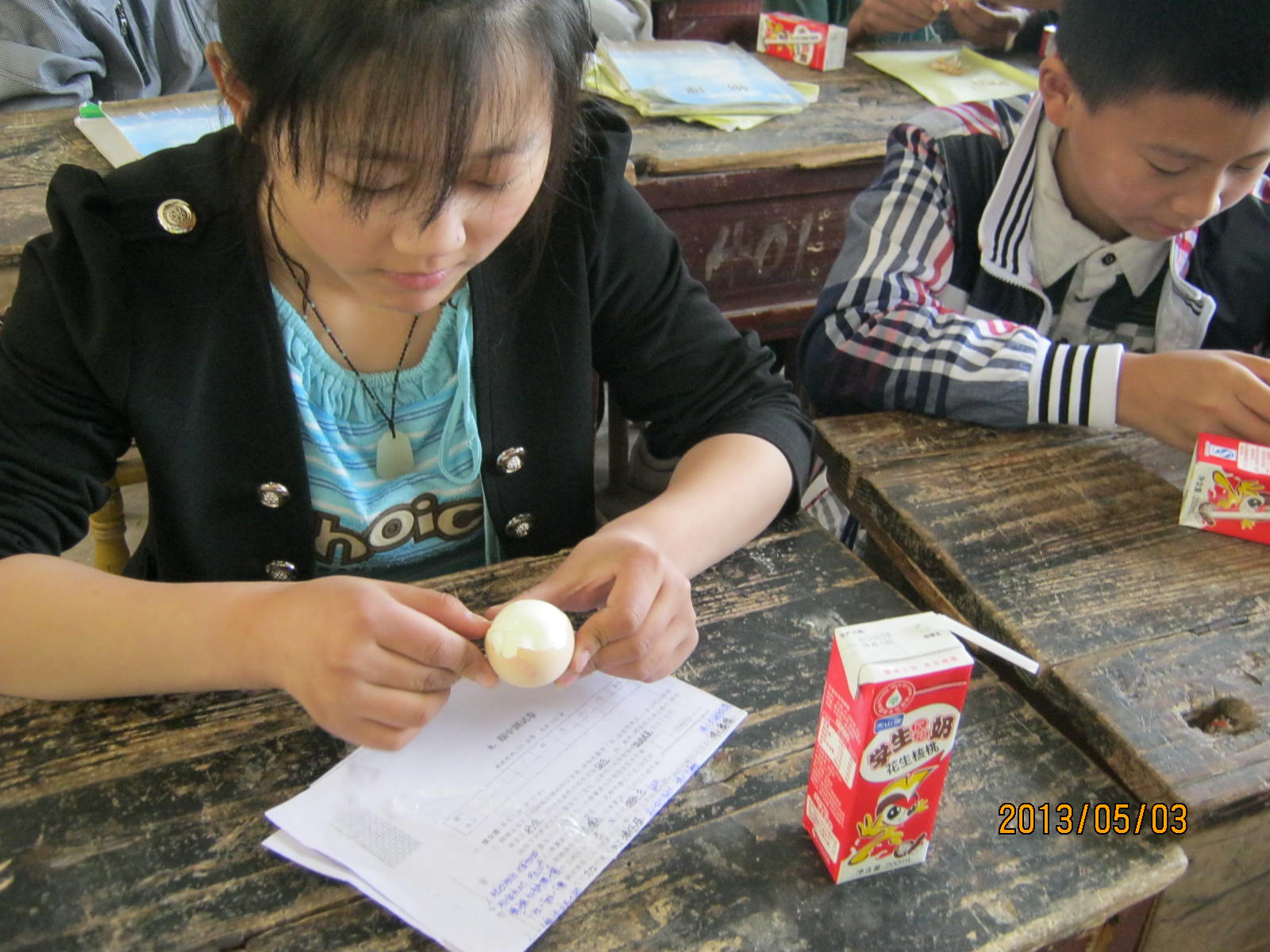 这一学期,营养奶由原来的每天两盒变成了一盒,取而代之的是一粒鸡蛋。每天每个学生一盒奶一粒鸡蛋。同学们很是高兴!每天规定的时间(课间操)一到,我们的生活委员便去食堂领鸡蛋。鸡蛋被放在预先准备好的盆里,生活委员按时去领取。瞧,我们班的生活委员是个大大咧咧的男孩子,不过他做这件事时去特别小心。你看那被领到班里的鸡蛋还冒着热气呢!生活委员先把盆子放到讲桌上,然后一粒一粒地发到每一位同学的手中,直到发完41粒。接下来就是大家一起剥蛋壳。蛋壳一掉,便露出白白的蛋青来,还散发出鸡蛋特有的香味呢。张嘴咬上一口,脆而可口,非常好吃!有的同学吃完后,便直勾勾地盯着那些没吃完的同学,舌头还不自觉地舔舔嘴唇。大家看到这个场景,都会笑这些同学是贪吃鬼呢!