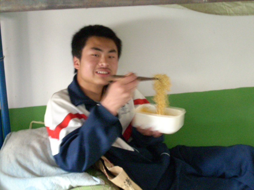 学习上认真负责的他,在生活中也是勤俭节约,你看他拿着方便面,满脸的笑容,如果我不告诉你那是方便面你是不是以为他在吃什么好东西呢。