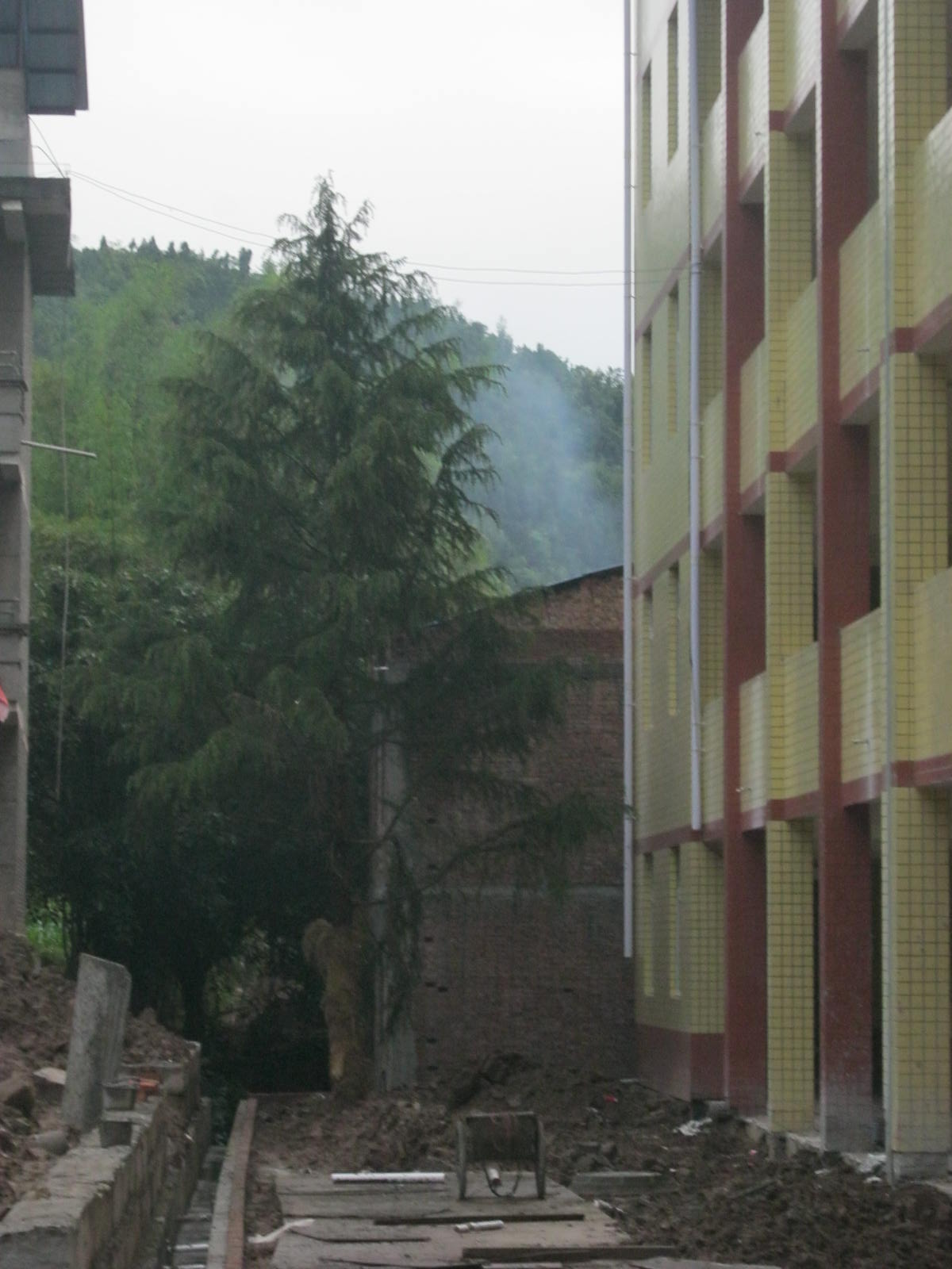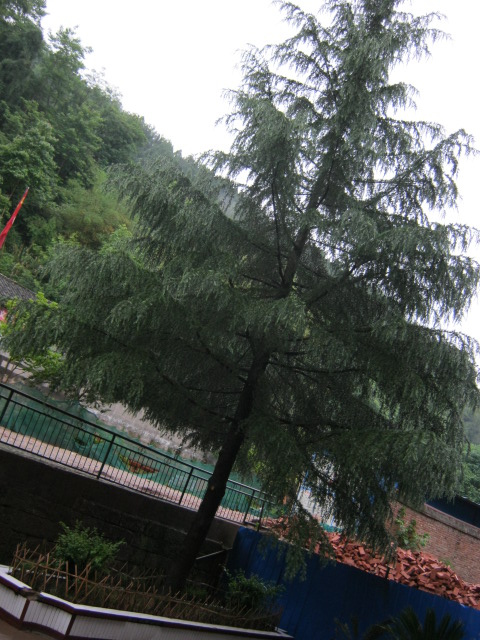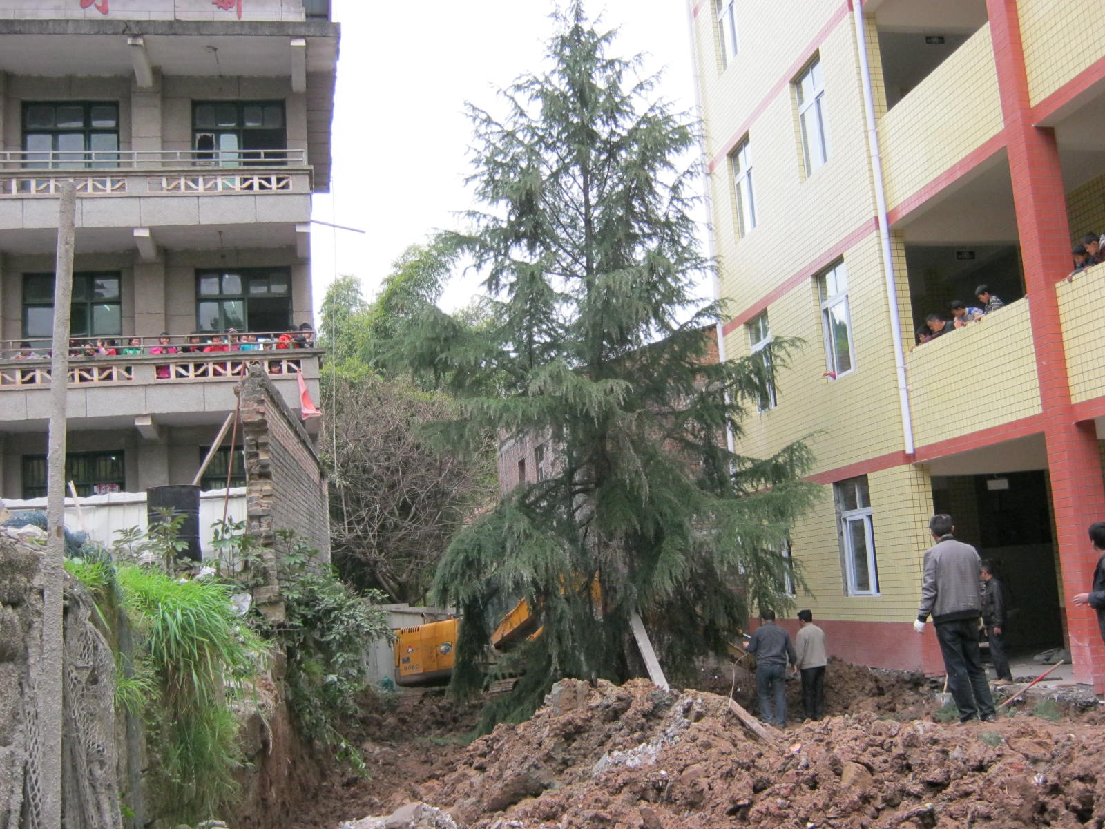 我校有两棵松针树,其中的一棵身材魁梧,因为花台废破而被移植到新修的教学楼前。
