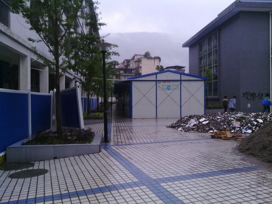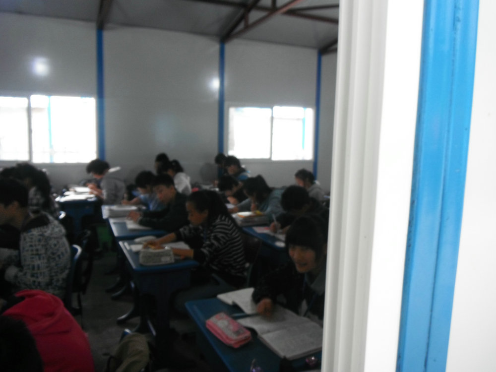 现在,一排排的板房搭在了塑胶操场上,一排板房几个班一起用,没有了电风扇,没有电子白板,只有一个黑板的粉笔。住在板房的同学很苦,太阳一出来人多,里面热得很;而一下雨板房内会进水。上课的时候班与班之间要相互干扰,有同学说上一节课能听两到三节课的内容。我们只有专心听本班老师的讲,稍一不注意就会分心。我们在教学楼上课的同学要比他们幸运多了。我们一定要珍惜。