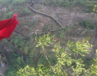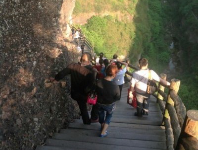 在导游的带领下,我们走到了山上。我从山上往下面看,好高啊!在我们的对面有一座悬崖峭壁,在悬崖峭壁上有一排排的楼梯,它是用木头制作的。看起来它很结实,走的人也很多,我在上面很害怕,因为怕它会塌下来,但是导游说:"不会的,来!让我带你一起走吧!你会觉得这是一种很不错的感觉,就像自己在空中飞一样。"我在导游的劝说下,放下了我的担心,跟着大家的脚步一起往前走。