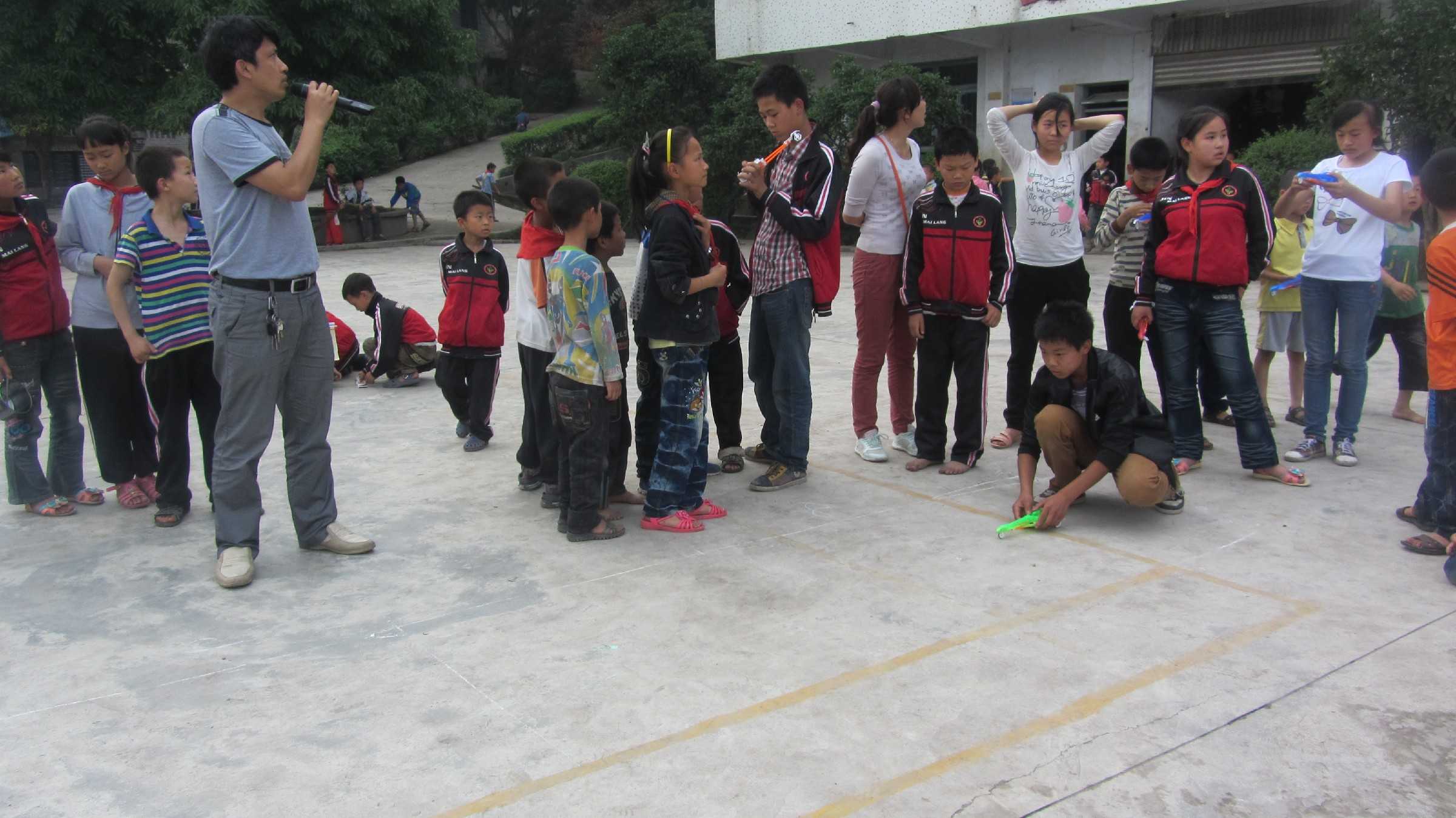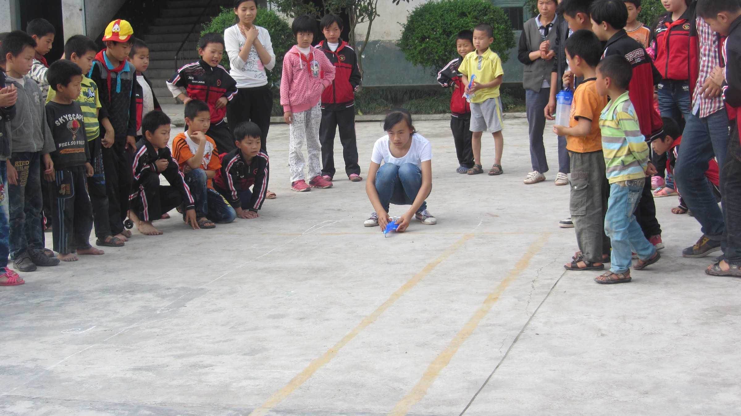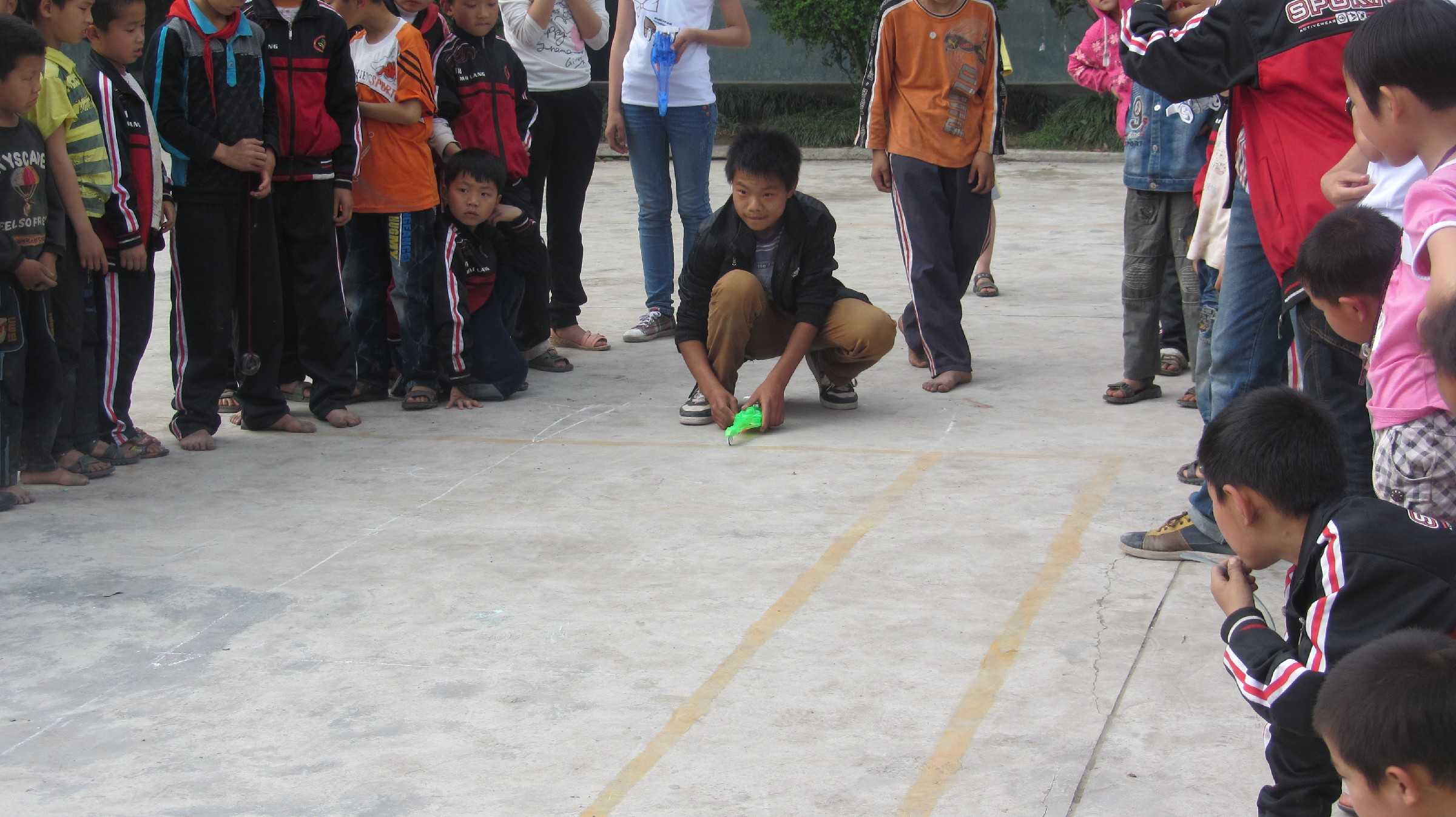 我拿着自己的飞机跑下了楼,只见在操场上已经有了专用的"飞机跑道"(其实就是用粉笔画的两条线),在边上还标示出了距离。另外几位选手也拿着自己的飞机跃跃欲试,江老师先介绍了比赛规则,就是我们试飞的时间。我试飞了两次,每次都是90分,嗯,还不错,他们的怎么样呢?