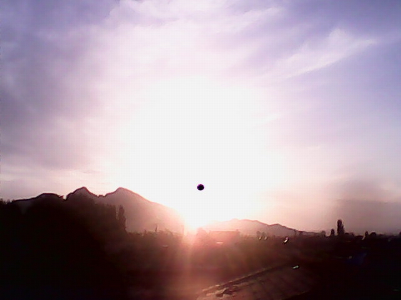 太阳淡下去,剩下深红的半圆,被树枝挂住。