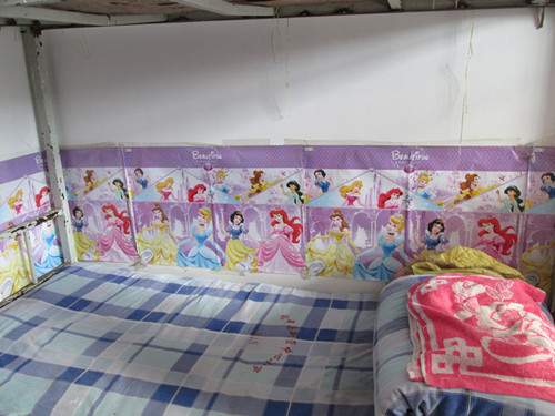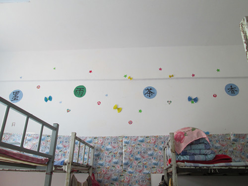 宿舍他更像我的家,我们设置的宿舍带点儿幼稚,又给人温馨,宿舍的墙壁上有八个大字“墨雨花香,文舞飞扬”其他是我们喜好贴上去的图画。