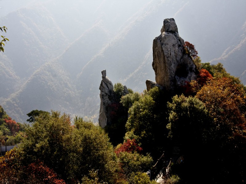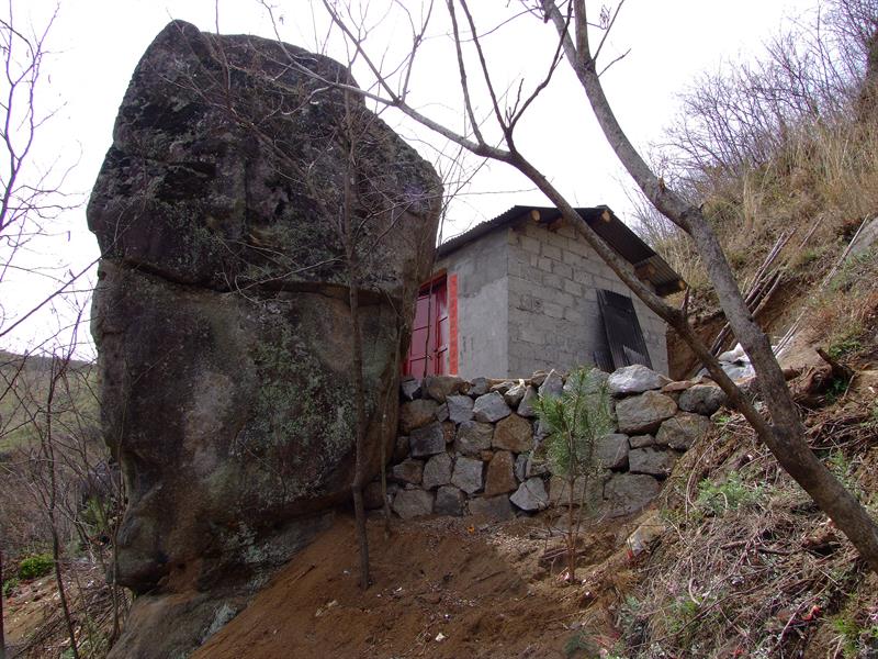 我们接着翻过一座山脊 ,沿着陡峭的山路缓慢前行,眼看出现了一块巨大的岩石,我们走到岩石旁边,被惊出了一身冷汗,演示下只有不到一米宽的通道,下面就是很陡的山坡了。从这摔下去,可就惨了。我小心翼翼的走过去,向岩石上面仔细一看,醒目的刻着"吉星高照"四个大字,每个字足有一个脸盆那么大。