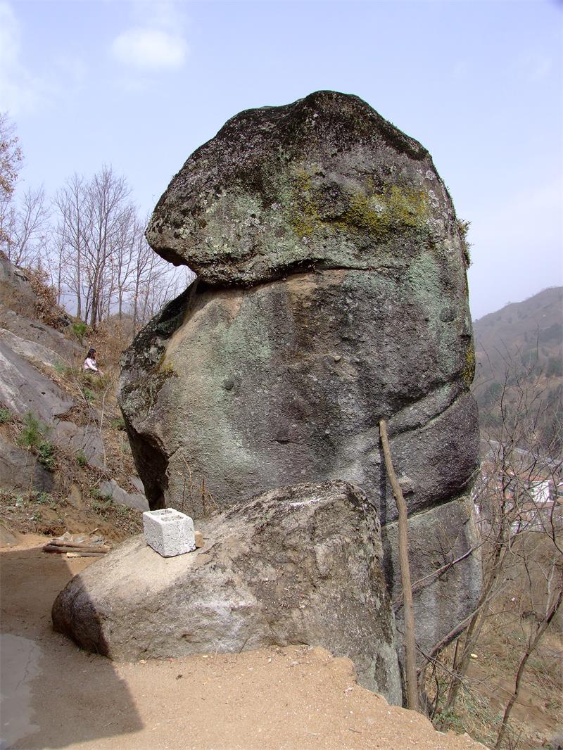 我们接着翻过一座山脊 ,沿着陡峭的山路缓慢前行,眼看出现了一块巨大的岩石,我们走到岩石旁边,被惊出了一身冷汗,岩石下只有不到一米宽的通道,下面就是很陡的山坡了。从这摔下去,可就惨了。我小心翼翼的走过去,向岩石上面仔细一看,醒目的刻着"吉星高照"四个大字,每个字足有一个脸盆那么大。