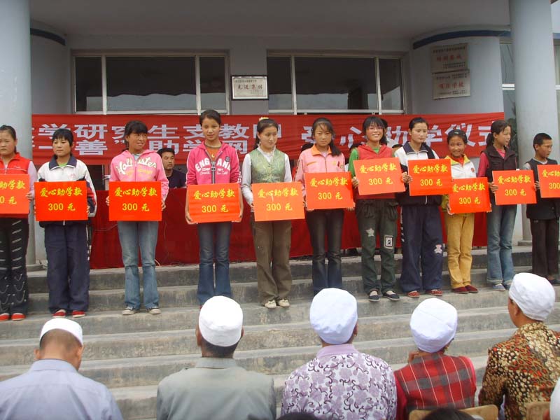 在2006年9月泾源二中迎来了宁大支教团的大学生,朱老师、冒老师、杨老师,他们是那么的亲切,和我们没有任何距离,他们被同学们那贫困和求知心所感动了,他们用自己的满腔热情为同学们做了很多感人的事,他们跋山涉水步行到我们的家中,了解我们的现状,及时的发到"日行一善"网上,为我们学校27名学生联系到了资助金,对于学生来说,每人300元,那是多么让人兴奋的一件事啊!