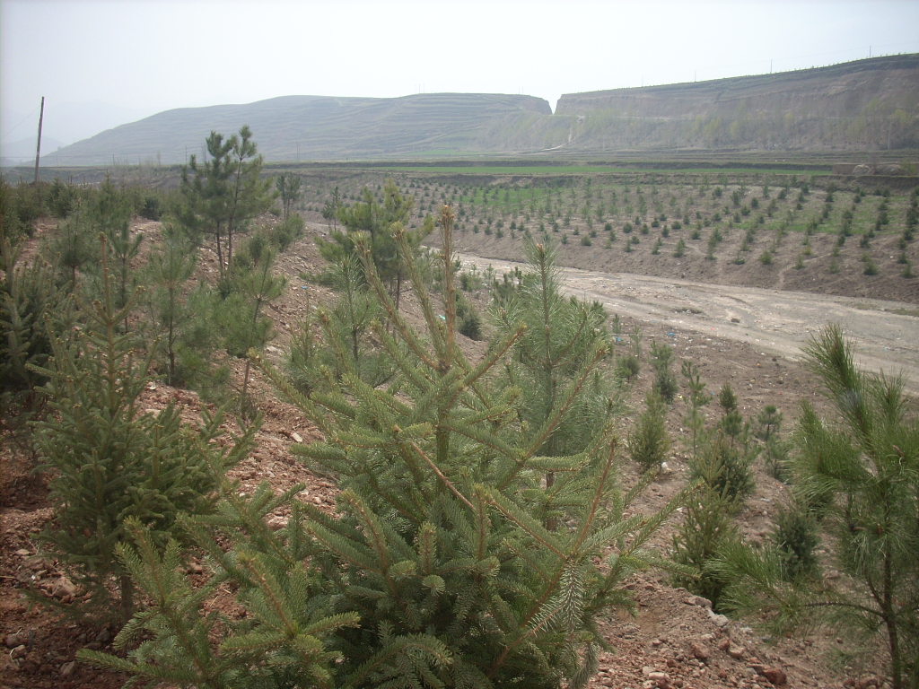 在如火如荼的拆迁中,我们不忘去植树美化我们的家园.你看以前一片狼籍的河道,现在变成了一片郁郁丛丛的松林,他们像卫兵一样保护着我们的家圆.