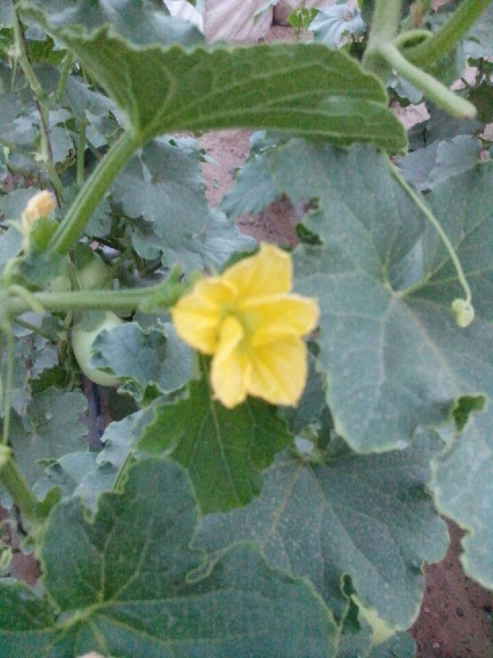 甜瓜的花是黄色的,那一朵朵黄色的小花真好看,闻起来味道很香。每天放学回家,和爷爷一起拿着药瓶给花授粉,在劳动中爷爷教会了我很多书本以外的知识。爷爷跟我说:由于大棚种植一般都是在沙漠地区,没有很多的昆虫来传播花粉,所以需要人工授粉,用来授粉的液体是红色的。先是从商店买来一包粉剂,和水按一定比例兑成液体,一点一点染到花粉上或者将花朵全部浸入药剂中,一两秒钟取出就可以了。