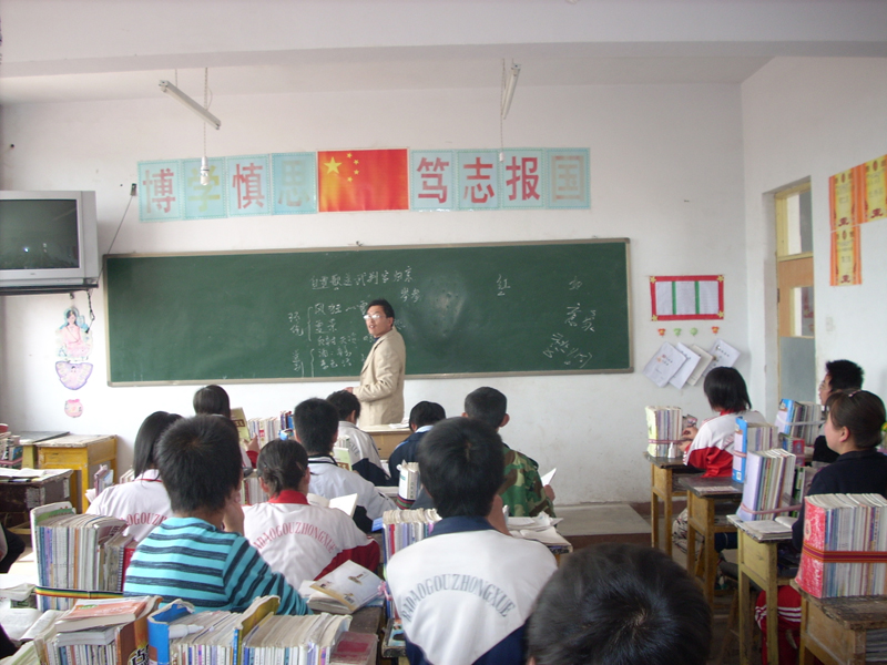 下课了他带着身的灰尘、一脸的微笑走出教室。