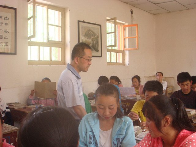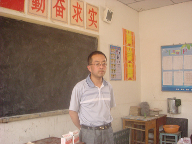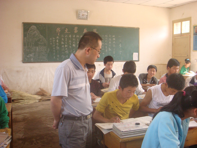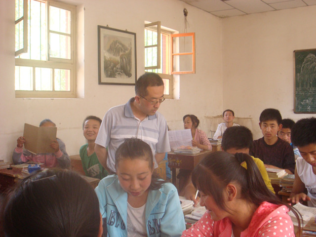 他个子不高,却很精神,一张清秀的脸,加上一双深邃的双眼配着一副茶褐色眼镜,越发显得精神,如果有机会和他近距离接触,你会惊讶的发现他的头发已花白了,那不是岁月磨打的再现,而是三尺讲台的见证,它的花白,粉笔清楚;它的花白,课桌明白;它的花白,我们八(5)全体最有发言权,是为了我们呕心沥血操劳的。