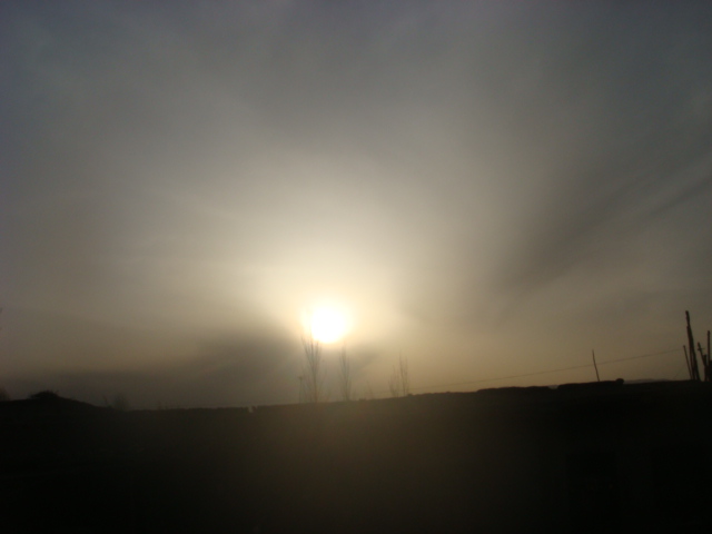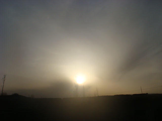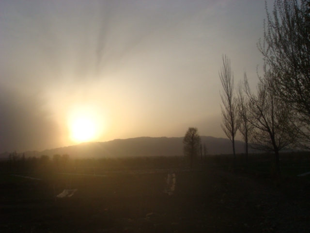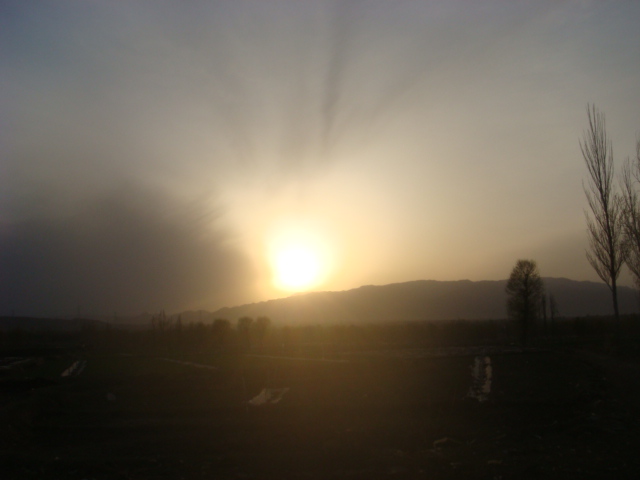 刹那间,血红的夕阳,突然滚落山底,再也不见上来。在青灰色的天幕下,几只晚归的小鸟,掠过河面------