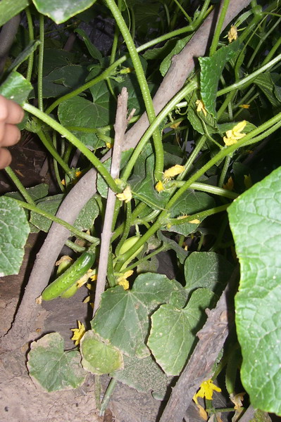 瞧!这是黄瓜,中指大的小黄瓜刚刚结出。还有几个含苞待放的小瓜苗想要冲破土地的枷锁茁壮成长。我想在不久以后所有的小黄瓜必定会长成大黄瓜。到那时候我就可以吃我最喜欢吃的糖伴黄瓜咯