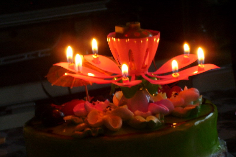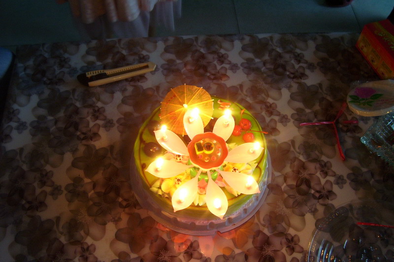 慢慢的,火光由亮到暗,由金辉灿烂到红尘弥漫,就在蜡烛快灭时,她许完了愿望,呼~~ 蜡烛灭了,吃蛋糕咯!