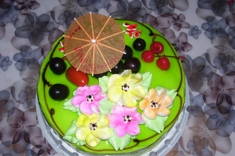 美味的生日蛋糕以水果为主。各色各样的水果将原本就已经很完美的蛋糕装饰的更加华丽。黑色与红色的相间搭配彰显出强烈色彩感。一边是色彩鲜艳,单调统一的水果,另一边是颜色丰富,形态不一的花朵,鲜明的对比有强烈的视冲击。