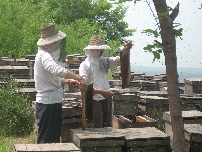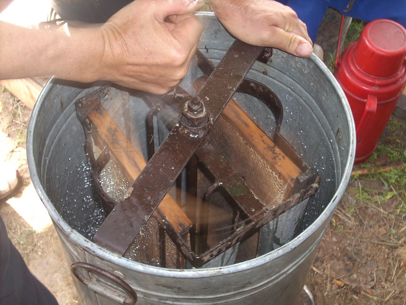 再来看看这个装置,一个大铁桶,里面安装了一个转轴,把沾有蜂蜜的木版放在里面,转动手柄, 板就随轴高速旋转起来,蜂蜜就飞落在桶壁上了,哈哈,这里好象利用了我们物理上所学的离心运动。一个板上可能取不出多少蜂蜜,但积少成多,时间长了,就出现了一桶一桶的蜂蜜。 我专门问过蜂蜜的价格,他们说,他们这里是非常纯净的蜂蜜,不含任何杂质,每斤是8元。就冲着纯净,许多人就专门赶到这里来买,而不去超市。