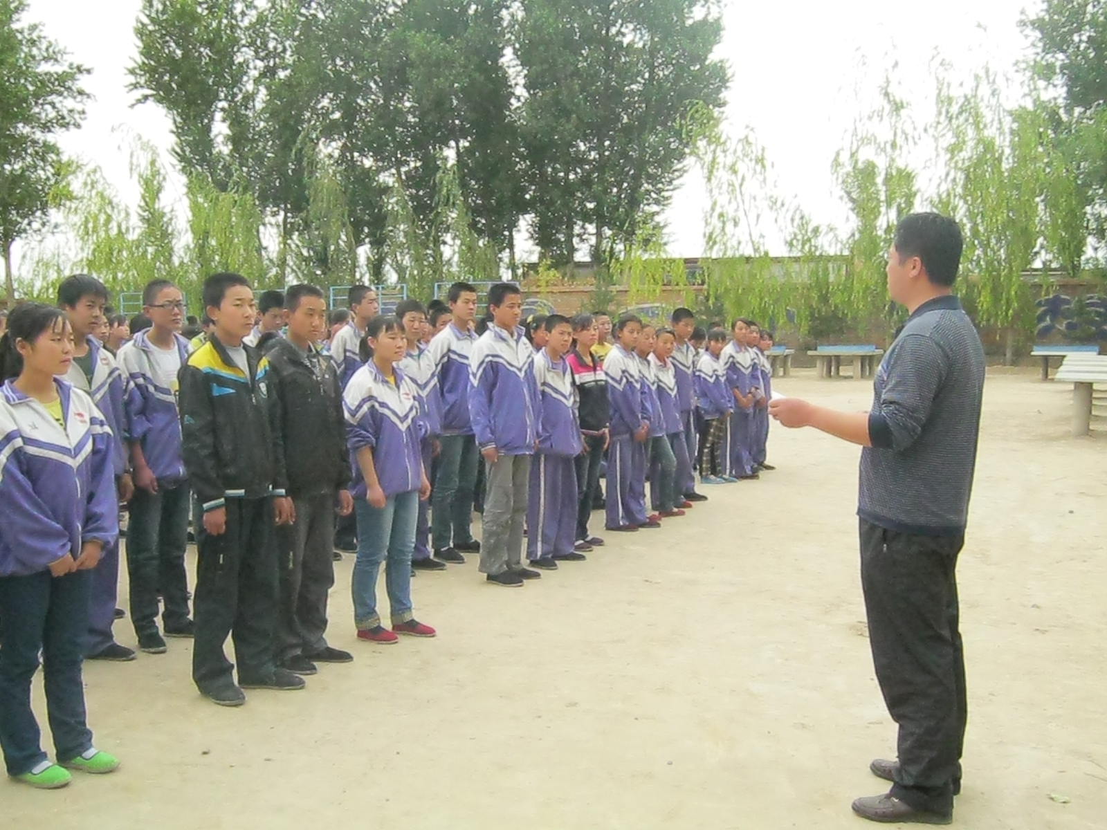 紧急演练就要结束了,同学们站在操场上,认真的听着校领导讲话。这次演练举办的很成功,希望我们以后能充分地理解灾难,用正确的方法对待。