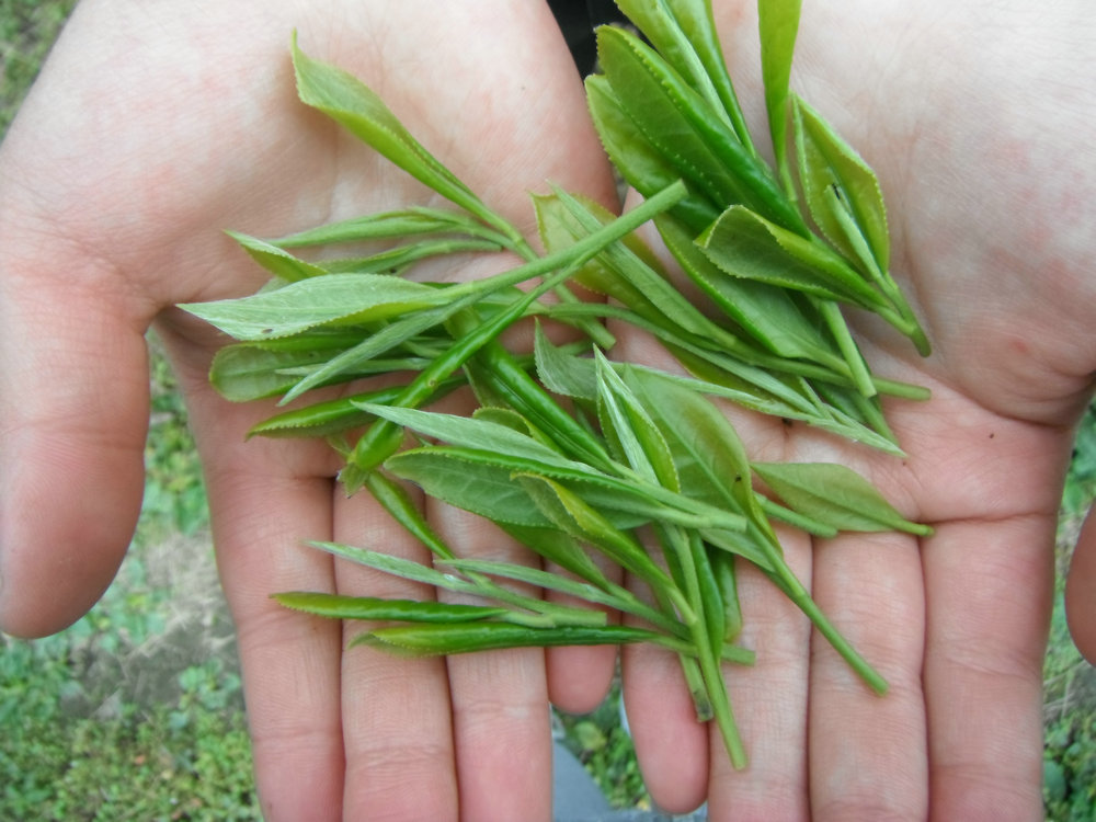 摘完茶后要经过挑选才能决定哪些能制茶,不过我们这里的茶质量都很好,只有极少数的茶叶叶子有残缺,其余的茶叶都是嫩嫩的,绿得让人爱不释手。