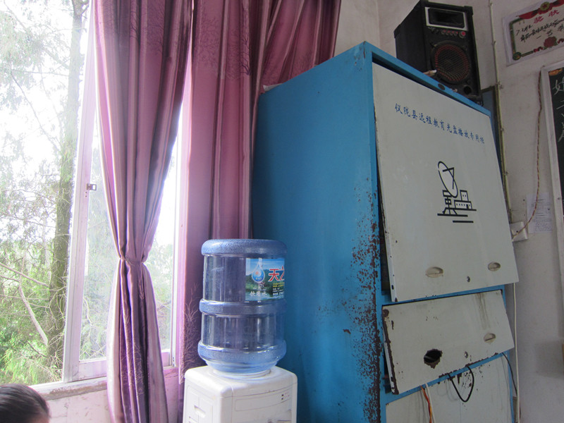 讲台的另一头,有着播放材料的多媒体长条柜,头上还顶着个大音响。这是这一角的"心脏"。咱们好多的课外知识都来自这个大家伙。饮水机就不必多说了,不过,夏天嘛,看见水桶前没人抢水的景象真罕见呢!配上后面的窗帘和窗外的柏树,真是一幅好静景的画儿!