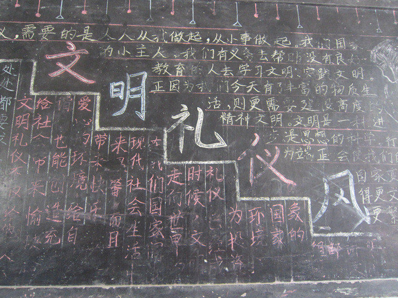 后面墙壁上的黑板报,那是我们班小小得意的成就,每个固定的时间都会换主题,看到"文明礼仪风"五个大字了吧!那就是我们向往的style。
