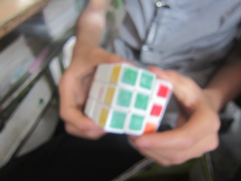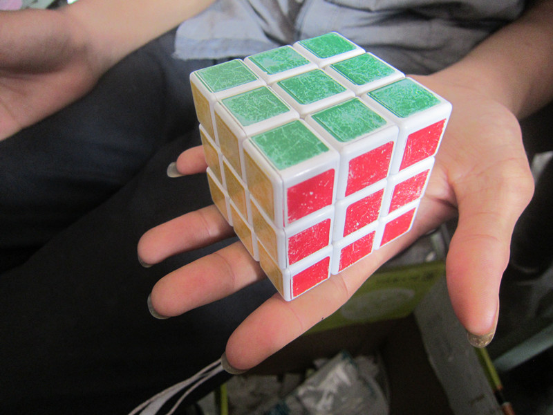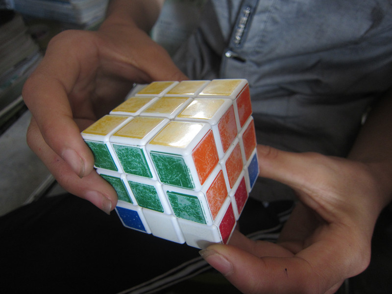 转啊转啊转啊转,拧过去拧过来,我勒个去,看得我眼花缭乱。每次下课,周围几个爱拧魔方的同学又不亦乐乎的捣鼓起来,看着他们那熟悉的动作和还原之后的自得,看得我那叫一个羡慕嫉妒恨呐!于是,我赶紧将我的魔方翻出来,然后屁颠屁颠地找"师傅"学了。