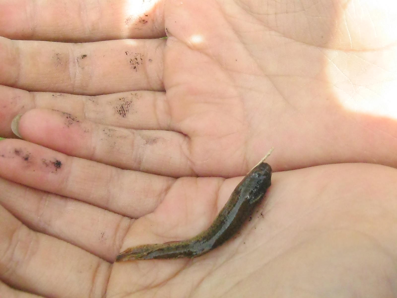 看似平静的水沟,实则是一个水下动物王国。我绕了好长的旱路才勉强到达水沟边,小豆同学一马当先,伸手在沟底摸索了起来。原本平静的水面被我们搅得混浊不堪,但总是皇天不负有心人,可怜的我们终于有了回报......