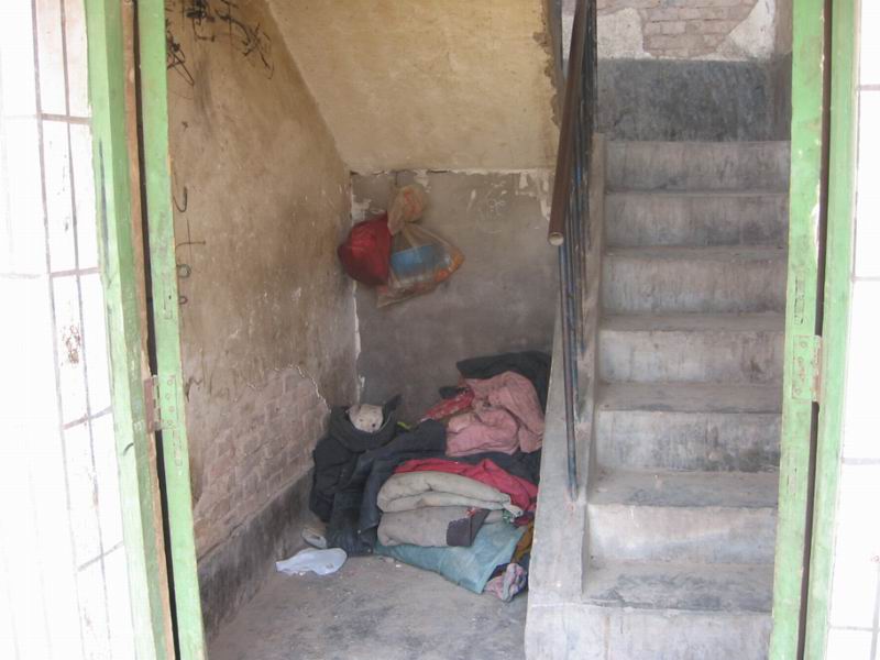她每天住在一间不足一平方米的小楼道里,里面放着一幅破旧的再不能破旧的被子。此时她正在吃午饭,他每天除了泡面还是泡面。当黑夜到来她只能静静地睡在那间漆黑的小别墅里,将自己的身体卷成一团睡着了。