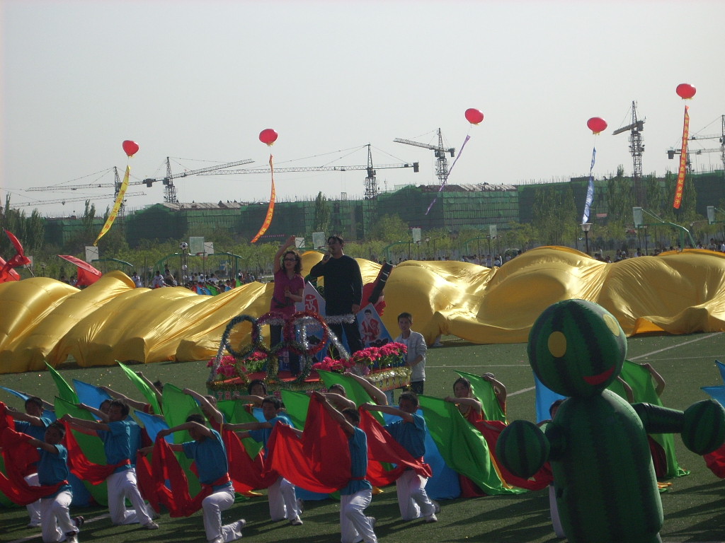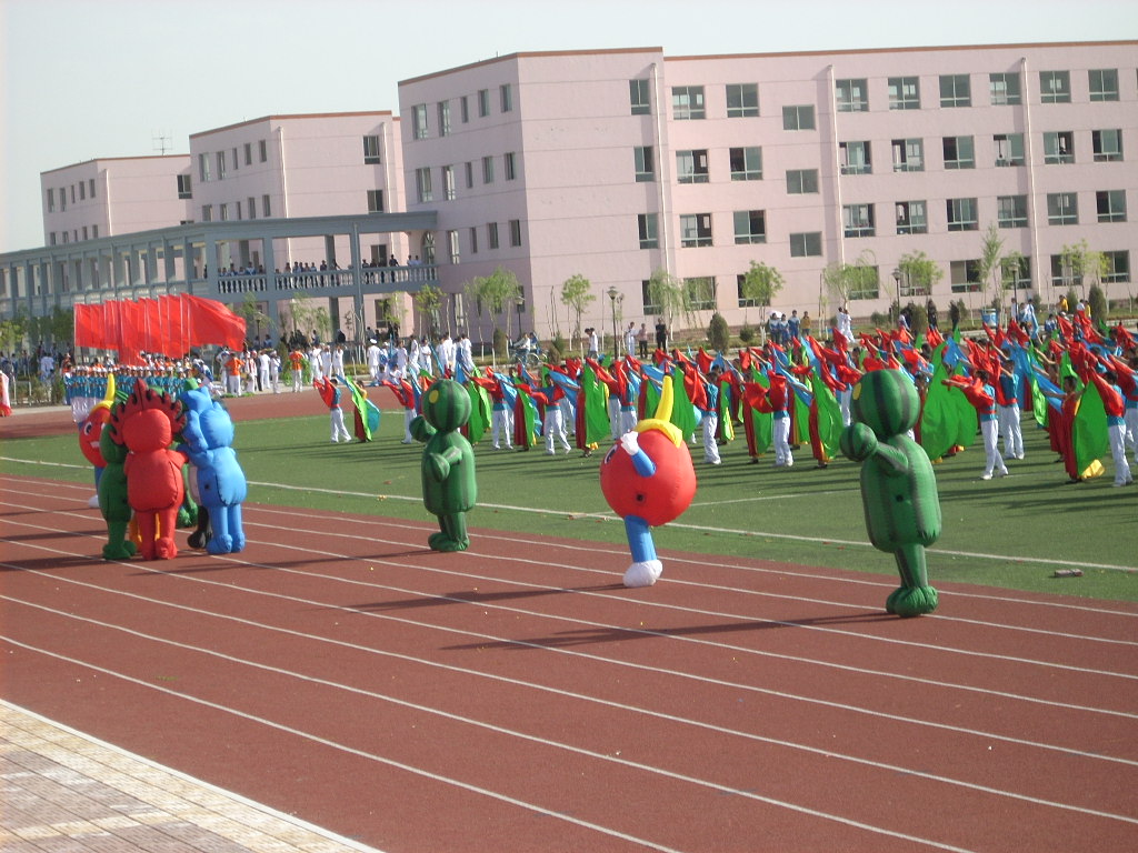 在运动会真正开始之前是 大型团体艺术操表演,看!操场上同学们紧张而又高兴的表演着,最前面是我们的奥运福娃聚集在一起,硒砂瓜、红枸杞也不甘寂寞跑上前来向众人挥动着双手。